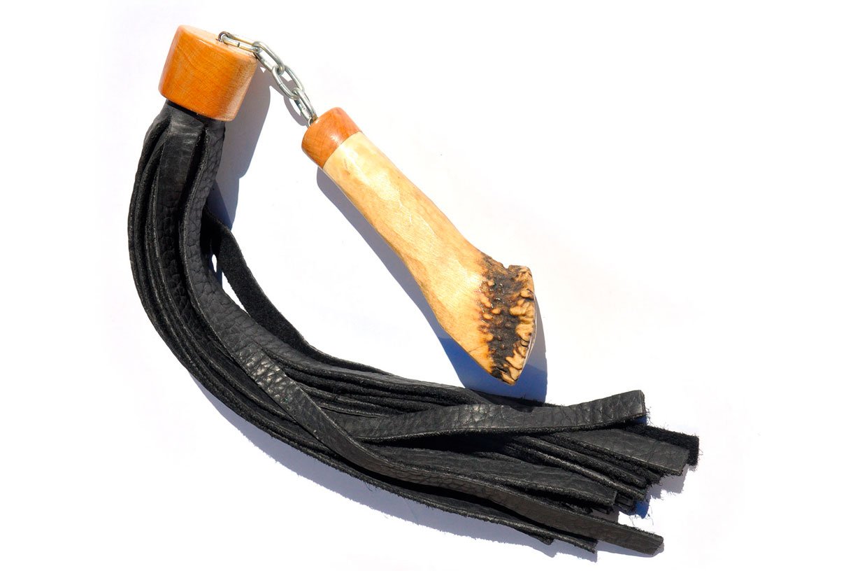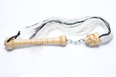 Beautiful scorpions tail. The handle is dark green twisted wood connected to a 12 inch cowhide fall.